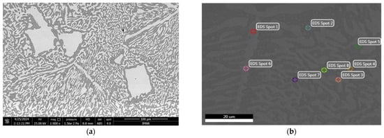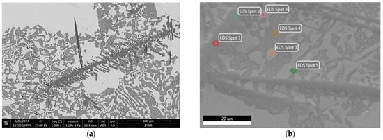 SEM micrographs of the Bi60Sn35Ag5 solder alloy: (a) General microstructure showing Bi–Sn eutectic regions and elongated intermetallic compounds (magnification: 1000×); (b) Higher magnification image highlighting needle-like Ag3Sn intermetallic phases embedded in the eutectic matrix, and the EDS analysis points (magnification: 5000×).