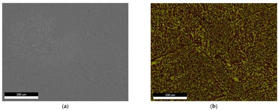 Optical (Figure 2) and SEM-BSE imaging (Figure 3) of the binary Bi60Sn40 alloy revealed a two-phase microstructure composed of Bi-rich dendrites embedded in a eutectic matrix. SEM-BSE confirmed the uniform distribution of the eutectic lamellae, while EDS mapping (Figure 4) indicated that these consisted primarily of alternating Bi- and Sn-rich phases. No additional intermetallic compounds were detected, which is consistent with expectations for a near-eutectic Bi-Sn system, corroborating earlier observations of [].
