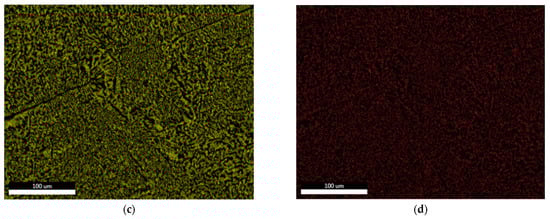 In Figure 4, the BSE imaging combined with elemental mapping via EDS was employed to visualize the distribution of the main alloying elements in the Bi60Sn40 solder alloy. Figure 4a presents the BSE microstructure, revealing compositional contrast across different phases. Figure 4b shows the superimposed elemental map with Sn in yellow and Bi in red. In Figure 4c, Sn distribution dominates, uniformly covering the matrix (yellow), which is consistent with its higher atomic percentage. Figure 4d illustrates the distribution of Bi, concentrated in smaller, dispersed regions, appearing in red. The maps indicate a heterogeneous microstructure, with Bi-rich areas embedded within a Sn-rich matrix.