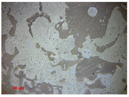 In the Bi60Sn35Ag5 alloy, the microstructure exhibited refined eutectic spacing and the emergence of secondary needle-like phases. Optical (Figure 8) and SEM-BSE analysis (Figure 9) showed these as bright, elongated features consistent with Ag3Sn intermetallics.