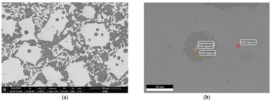 SEM micrographs of the Bi60Sn35Sb5 alloy: (a) Microstructure with large primary Bi-rich grains embedded in a Sn-rich eutectic matrix and dispersed Sb-containing precipitates (magnification: 1000×); (b) Enlarged view of a primary Bi grain containing a central Sb-rich inclusion and surrounding fine intermetallic dispersions with the EDS analysis points (magnification: 5000×).