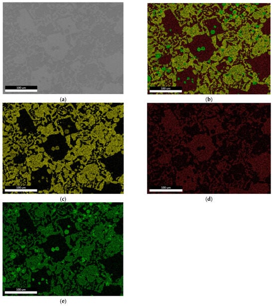 Figure 7a shows the BSE microstructure, highlighting compositional contrasts among different phases. In Figure 7b, the overlapped elemental map visualizes Sn (yellow), Bi (red), and Sb (green). Figure 7c reveals that Sn is predominantly distributed in the matrix, forming a continuous phase. Figure 7d shows Bi-rich regions that appear more localized and concentrated, and Figure 7e indicates a uniform but somewhat dispersed presence of Sb, primarily located around or between the Sn and Bi phases. The elemental maps confirm a heterogeneous distribution, with each element forming distinct microstructural domains.