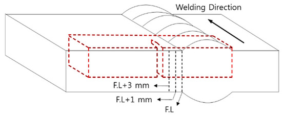 To evaluate the fracture toughness of the HAZ, T–L type notches were introduced at distances of 1 mm and 3 mm from the fusion line, as shown in Figure 2. In order to accurately position the notches within the target HAZ region, the fusion line was identified by metallographic etching after machining. This allowed precise placement of notches in the desired microstructural zones. Figure 3 illustrates the sampling orientation of the specimens. Through-thickness notches were machined perpendicular to the weld line direction. After machining the notches, fatigue pre-cracks were introduced and extended by approximately 2.3 mm to achieve a target crack ratio of a/W = 0.53. The total crack length, including the machined notch and the fatigue pre-crack, averaged 40.3 mm.