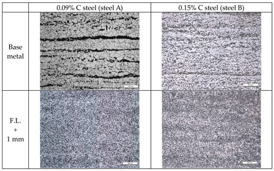 Microstructures at different distances from the fusion line for 0.09% C and 0.15% C steels.