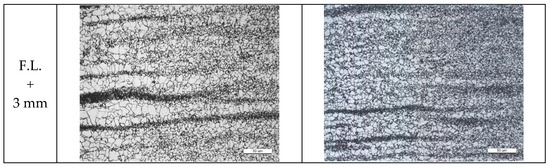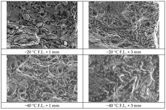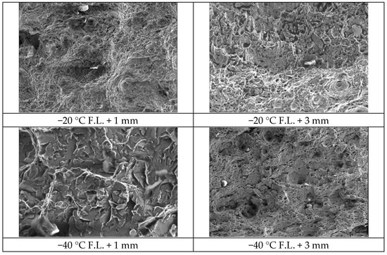 At −20 °C, predominantly ductile fracture features were observed in both steels, while at −40 °C, a mixture of ductile tearing and cleavage fracture was more frequently seen. Overall, these results suggest that plastic deformation occurred near the notch tip at F.L. + 1 mm and that the fracture behavior was not strictly temperature-dependent. Instead, most specimens exhibited a mixed-mode fracture morphology regardless of test temperature or notch location.