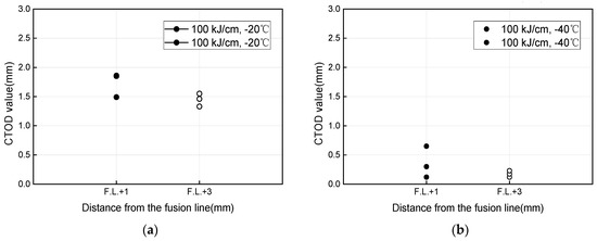CTOD values for Steel C (0.11% C) at different distances from the fusion line under test temperatures of (a) −20 °C and (b) −40 °C.