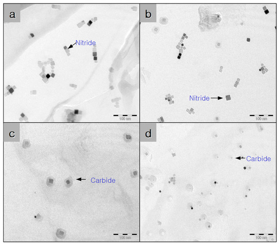 To analyze the morphology and composition of precipitates within the microstructure, TEM was employed using a replica technique. For this purpose, non-magnetic specimens were prepared by etching mechanically mirror-polished surfaces in an ascorbic acid-based solution (890 mL methanol + 100 mL acetylacetone + 10 g tetramethylammonium chloride). After etching, a carbon film was deposited onto the specimen surface. The carbon replica, with precipitates adhered to the film, was then separated in the AA solution and transferred onto copper grids for TEM observation.