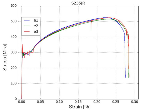 Stress–strain response of S235JR steel as measured from 3 experiments.
