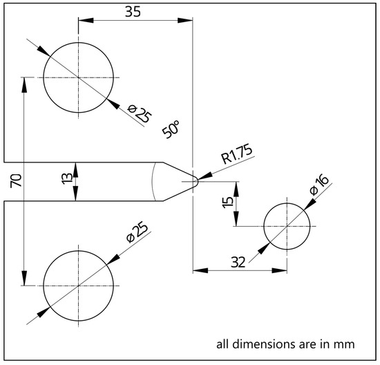 The base geometry of the reference specimen is illustrated in Figure 2. The specimens were cut from a 10 mm thick sheet of hot-rolled S235JR mild carbon steel using waterjet technology. To achieve the necessary clearance in the clamping pin holes (25 mm diameter) and the cold-hole-expanded hole (16 mm diameter), the rough contour was further machined. Derivations of the reference specimen were made by drilling an additional hole of the same dimensions as the cold-hole-expanded one. Figure 3 depicts the two derived configurations named A and B. Configuration C was obtained by introducing an additional notch to a B-type specimen, as shown in Figure 4.