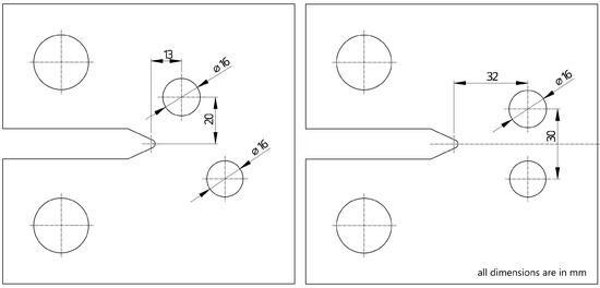Geometry of type A (left) and type B (right) specimens. They are a modification of the reference specimen by drilling an additional 16 mm diameter hole.