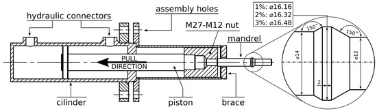 The introduction of residual stresses is achieved by the cold-hole expansion technique. We developed a prototype hydraulic mandrel pulling device, whose cross section is depicted in Figure 5.