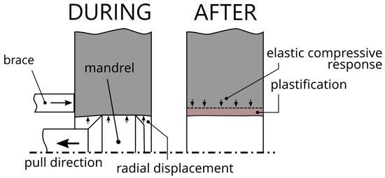 The principle of hole expansion is shown in Figure 6. The oversized mandrel is pulled through the hole, causing radial displacement of the specimen material. The oversize should be sufficient to induce material plastic flow. The material surrounding the hole is compressed, and an elastic tensile stress develops around the hole to maintain internal equilibrium.