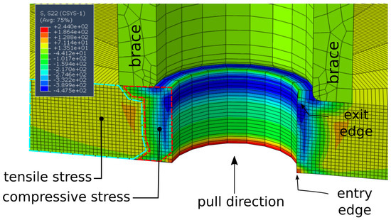Figure 7 displays the results of a cold-hole expansion simulation conducted using the Abaqus 2017 finite-element solver. An axisymmetric model is employed to illustrate the stress state following the passage of the mandrel. The residual stress profile is influenced by the entry and exit conditions, which is also verified in previous studies [21,22]. In this simulation, CAX8 elements with a size of 0.5 mm were utilized to model the 10 mm thick specimen. The brace is represented as a rigid domain, and the friction coefficient between the mandrel and the specimen is assumed to be 0.1 (see [23] for solid graphene lubrication in a humid condition).