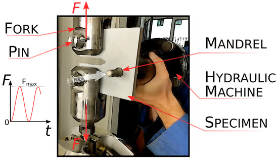 All specimens are subjected to a pulsating dynamic force with a load ratio . The maximum forces, the hole expansion (HE) ratios, and the frequency of the applied load are summarized in Table 1.