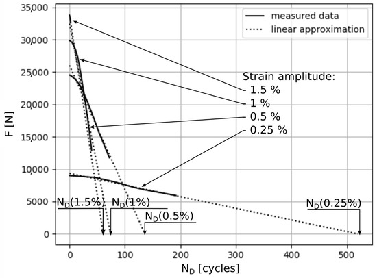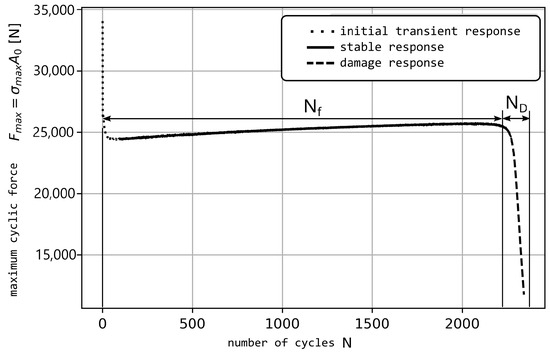 Maximum force response of test specimen subjected to constant amplitude strain [18], with the permission from MDPI AG, 2025.