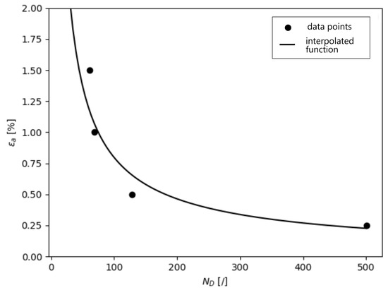The specimens in this study are sufficiently loaded in order to focus on low-cycle-fatigue analysis. Still, the number of cycles is too large to model them directly using the finite element approach (FEM). A direct cyclic analysis (DCA) is employed to predict the stable stress–strain response of the domain. In each integration point of the FEM mesh, equivalent stress and strain are calculated. Equivalent stress is calculated on the premise of hydrostatically signed von Mises stress in each increment of the cyclic load. The analysis of this fluctuating equivalent stress is used to calculate the mean stress in every integration point in the FEM mesh. Similarly, the Tresca equivalent strain is calculated, and strain amplitude is derived. Using Equation (2), the number of cycles to crack nucleation is calculated in each integration point and extrapolated to the mesh nodes. In the first step of the calculation, a failing node with minimum is determined; other nodes receive this number of cycles as relative damage based on a linear accumulation rule of Palmgren–Miner. The algorithm then searches for a neighboring node with the highest , which translates to the highest probability for the crack growth direction. The failed node is duplicated, and together with the neighboring node, a new crack surface is introduced in the shape of a wedge. This node splittage method is suboptimal for crack modeling mainly because of high dependency on mesh size, and the instantaneous nature of growth is unrealistic. To partially address these two issues, a cohesive contact (CC), as shown in Figure 10, is introduced between the newly developed free edges with sufficient stiffness in order not to disrupt the stress state around it. CC is a linear elastic connection between the edges, and the idea of continuum damage mechanics is employed to simulate the macro scale effect of a crack growing inside the CC. Here, the fracturing damage D is derived from the observations of a number of cycles for crack growth under the influence of strain amplitude (see damage response in Figure 9). The prediction of the number of cycles for crack growth is based on a linear regression curve of the stiffness reduction part of the strain-life-tested specimens, as shown in Figure 11. A power function is derived connecting to , as shown in Figure 12 and Equation (3). Because this observation is valid only for the test specimens, a correlation is made to the scope of CC. A relative surface bearing ratio is calculated between specimen cross section and CC cross section , as shown in Equation (4).