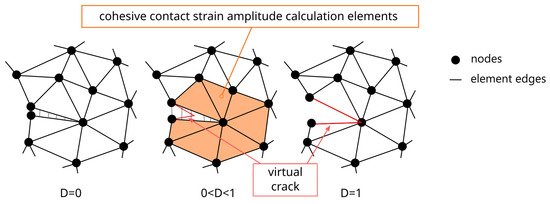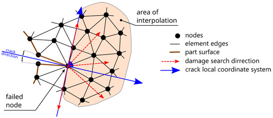 The strain amplitude inside the CC is calculated as an average of the strain in CC-connected elements, as shown in Figure 13. With this simple process, the number of cycles to complete crack growth through CC, termed , is derived. Fracturing damage D is a relative scalar that influences the components of the CC stiffness tensor. When a new CC is introduced, its initial damage is , and it acts under full rigidity. When the crack grows, the damage parameter increases and therefore the stiffness decreases. The crack propagates virtually inside the CC, as illustrated in Figure 13. As in the fatigue part of the calculation, here also, a stepwise approach in crack growth is introduced. The user of the algorithm specifies the permissible damage jump in each increment of the calculation. In this study, was used, whose results show that the crack grows the entire length of the CC in two increments. Smaller values result in a direct simulation of crack growth, and larger values result in more instantaneous growth. Here, a large was used in order to gain a coarse insight into the direction of crack growth. The global jump in the number of cycles is thus determined on the basis of , the corresponding current D in CC, and . As before, the damage parameter D accumulates linearly from 0 to 1, and is calculated on the same principle as in the crack initiation phase by the Palmgren–Miner approach. This results in a global step forward in the number of cycles, which increase in non-failed nodes and D in CCs. At any time, a new crack front can appear if a node fails before the complete rupture of CC. When the CC fails , the tip or the aforementioned neighboring node forms the crack front. A search algorithm is employed that determines the direction of maximum damage in several directions, as shown in Figure 14. When a neighboring node closest to the path of maximum damage is identified, this forms the direction of crack growth by again duplicating the current tip node and forming a new CC with the identified node. Further information on the material model used for the DCA analysis is available in [3] and an in-depth explanation of the novel algorithm in [18].