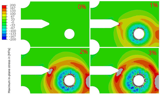 For insight into the magnitude of residual stresses, Figure 15 depicts fields of maximum in-plane principle stresses at different levels of hole expansion. As the material expands here as deformation hardening, the yield stress increases. There is a maximum of this hardening that we can achieve as the material can start to yield in the opposite direction as the mandrel is removed. This combination of isotropic–kinematic hardening was studied in great detail in [18]; here, only the effect is visible by comparing the results of 2% and 3% hole expansion, where no significant contribution of residual stresses is present at a higher expansion level.