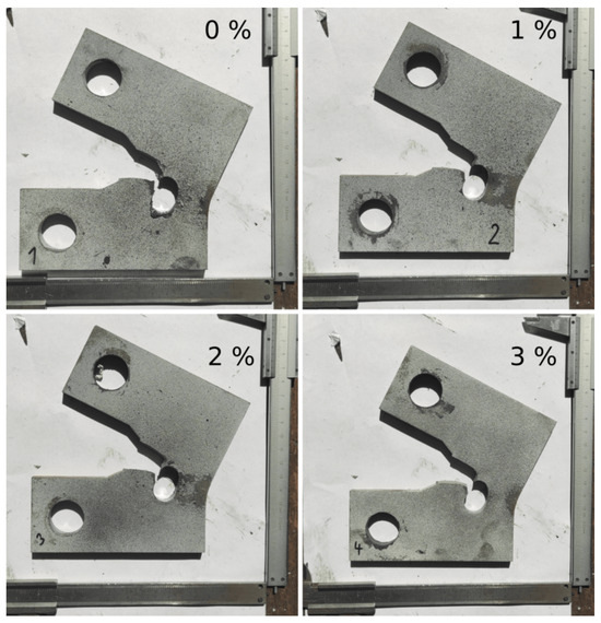 Final state of reference specimens. The number in % corresponds to the oversize of the mandrel for cold-hole expansion applied prior to fatigue loading.