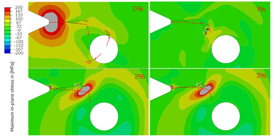The experimental results depicted in Figure 16 illustrate that the fatigue crack initiates from the rounded notch and propagates towards the hole. The numerical analysis results are now focused on, shown in Figure 17, which display a consistent trend of fatigue crack growth. In all cases, the crack initially propagates horizontally and then sharply diverts towards the hole. In the case without the imposition of residual stresses (0% HE), a new crack appears first on the top part of the hole surface when the main notch crack has reached the length shown in Figure 17. We believe that this observation can be attributed to two phenomenons, the absence of crack-retarding compressive residual stresses near the hole and the fact that the combined effect of grown notch crack and hole has reduced the bearing surface, resulting in a new critical site for crack nucleation. This newly formed crack was not directly observed in the experiment due to the fact that this area undergoes large deformations as the load-bearing surface decreases due to the growing crack. In future, a displacement instead of force control would be more sensible. As the top crack, from the numerical simulation, grows toward the main notch crack, a new crack is nucleated on the bottom of the hole. The algorithm cannot connect two cracks; therefore, the region between the top and main notch crack is unable to propagate either crack; therefore, a new crack is nucleated on the bottom.