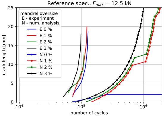 The results in Figure 18 compare the crack growth rate between the experimental and numerical analyses. Overall, the numerical analysis does not accurately capture the crack growth rate and provides non-conservative predictions in terms of cycle calculations. One of the main contributors is the averaging of specific deformation in and around the crack-governed cohesive contact (please see [18]) and the prescribed large damage step . However, the numerical analysis does capture the exponential rate trend typically observed in fatigue crack growth. Additionally, it confirms the experimental observation that increasing cold-hole expansion leads to a decrease in the number of cycles to crack nucleation.