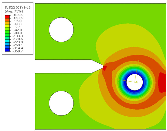 Numerical results of stress state after the imposition of residual stresses by applying a displacement on the hole in the radial direction (3% hole expansion). Depicted stresses (S22) are transformed by the cylindrical coordinate system that is concentric to the cold-expanded hole and are shown in the principal direction of the r, , z directions.