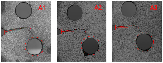 Final stages of A1, A2 and A3 specimens. The crack (dotted line) initially diverts from the horizontal direction (solid line) toward the top hole but concludes in the bottom cold-expanded hole (split line).