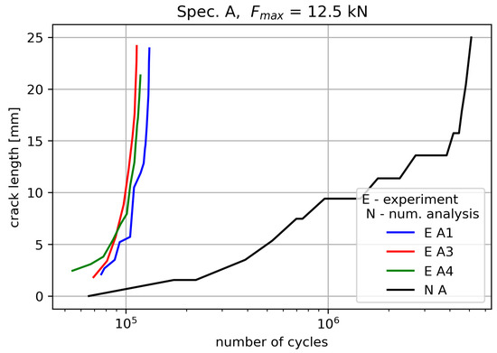 Experimental–numerical comparison of fatigue crack growth rate for the A specimens.