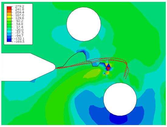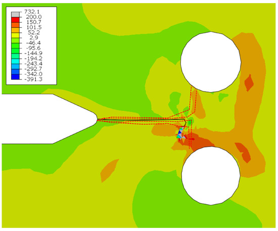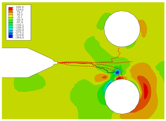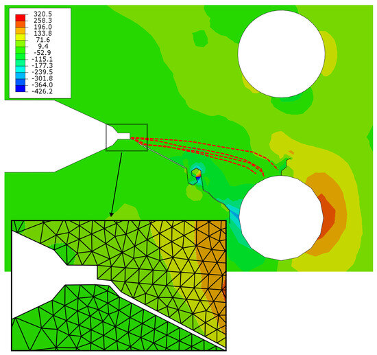 Results of maximum in-plane stress for the fatigue crack growth algorithm for specimen B at kN load, where the bottom hole is expanded. The red dotted line shows the overlaid experimental crack path.