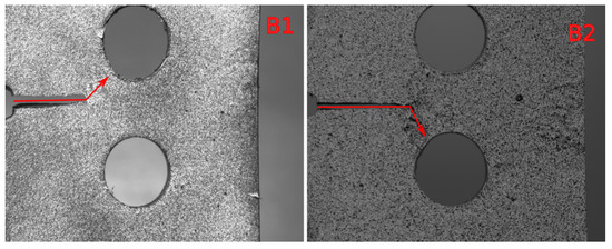 Final stages of B1 and B2 specimens, subjected to kN load, without imposition of residual stresses. The crack initially grows in the horizontal direction and sharply turns toward one of the holes.