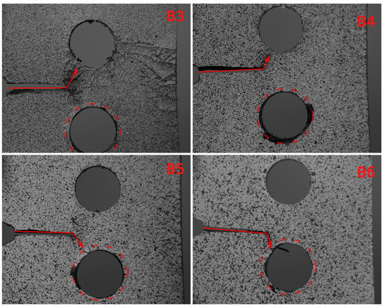 Further tests were conducted on type B specimens with cold expansion. As depicted in Figure 24, the red circle represents the bottom cold-expanded hole. The results once again demonstrate that cold expansion does not affect the location where the crack concludes. The images captured show the final stages of the test, just before the crack exponentially grows towards the hole.