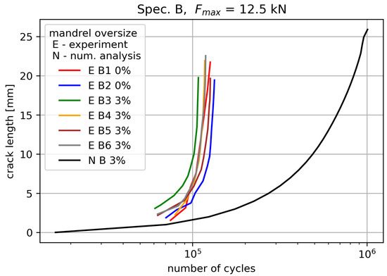 Experimental–numerical comparison of fatigue crack growth rates for the B specimens at kN.