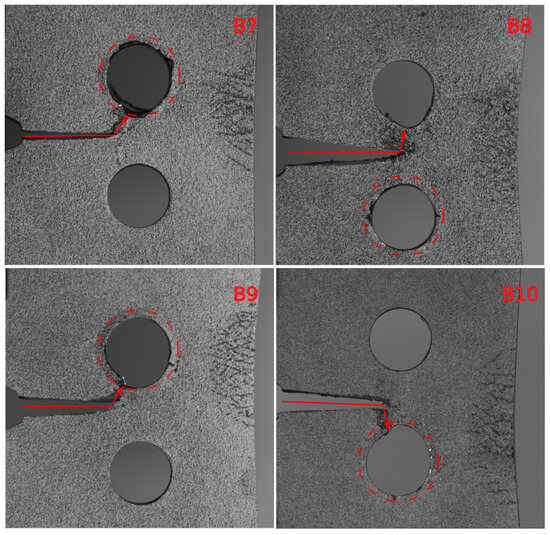 In the symmetrical B-type specimens, it is observed that the growing fatigue crack tends to ignore the induced residual stress field and concludes in an arbitrary hole, particularly at higher fatigue load amplitudes. However, there is an exception in the C1–C4 specimens, where the crack consistently concludes in the cold-expanded hole. This trend is partially observed in specimens C5–C8 as well, indicating that, by lowering the force amplitude, the effect of the residual stress field becomes more dominant. It is important to note that these experiments have a limited number of specimens, and statistical significance cannot be attributed to the observed phenomena.