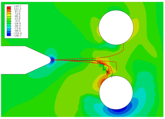 The numerical results shown in Figure 25 indicate that the crack initiates from the notch and proceeds horizontally. When it approaches the holes, it sharply turns towards the bottom cold-expanded hole. This observation aligns with the idea that the crack growth algorithm is attracted to the tensile stresses that result due to imposed compressive stresses.