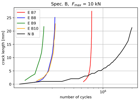 The four additional specimens, B7 to B10, were subjected to a reduced maximum fatigue load of in order to increase the influence of residual stresses. The location of the cold-expanded hole was alternated between the bottom and top hole, as shown in Figure 27. This alternation was performed to minimize the potential influence of loading pin friction on the crack growth direction.