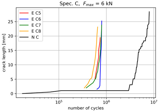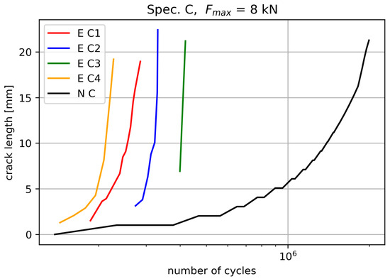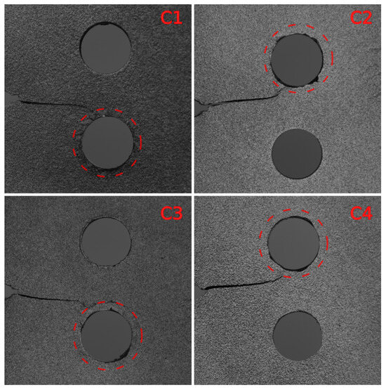 We continue our quest of lowering the maximum fatigue load (). Here, specimens C1 to C4 were used with a sharper initial notch to promote the early onset of fatigue crack. As depicted in Figure 30, the crack in all specimens concluded in the cold-expanded hole. Notably, the crack already showed a tendency towards the cold-expanded hole in the initial stages, deviating from the horizontal direction observed in previous B-type specimens.