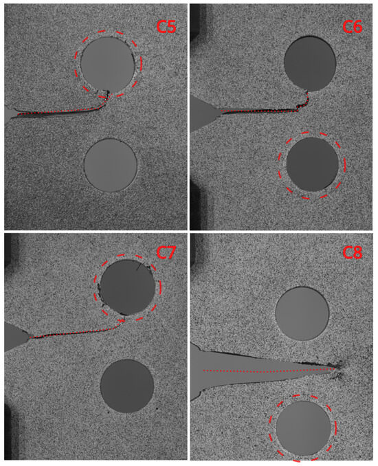 In the last set of experiments, C-type specimens were subjected to a reduced fatigue load of . The experimental observations shown in Figure 33 reveal that the crack concludes in the cold-expanded hole for specimens C5 and C7. However, on specimen C6, the crack initially grows horizontally and then abruptly jumps toward the non-expanded hole. On specimen C8, the crack completely disregards both holes and continues to grow horizontally past them.
