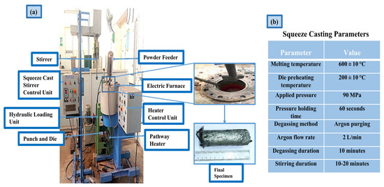 (a) Schematic representation of the squeeze casting setup and (b) Squeeze casting parameters.
