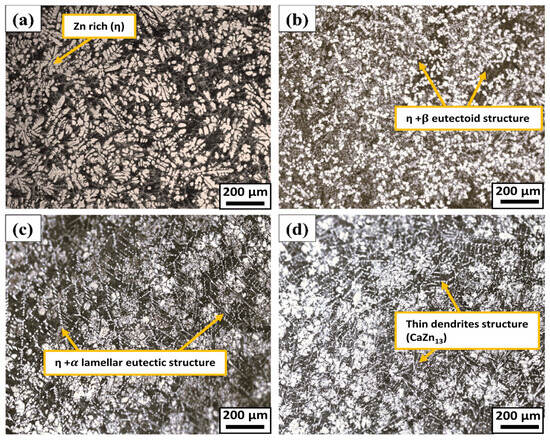 OM images of Zn-Al-Cu-Mg alloys, both with and without Ca addition. (a) Base alloy; (b) 0.5 wt.% Ca; (c) 1.0 wt.% Ca; (d) 1.5 wt.% Ca.