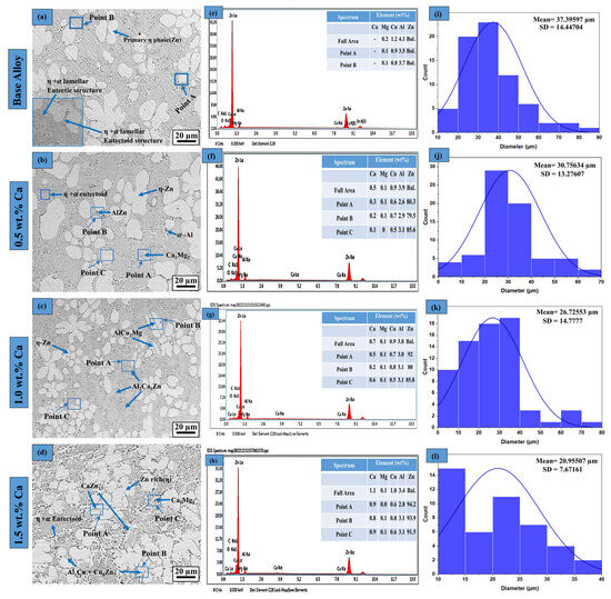 (a–d) SEM morphology of the Zn-Al-Cu-Mg alloy without and with Ca addition, (e–h) showing EDS spot analysis locations (full area and points A–C) and (i–l) average grain size measurement of the Zn-Al-Cu-Mg alloy without and with Ca addition.