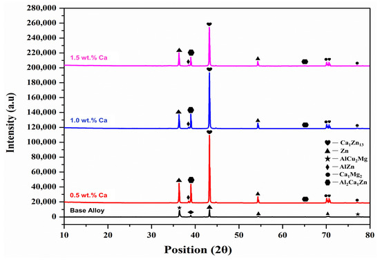 As shown in Figure 4, all samples exhibit dominant peaks corresponding to the η-Zn matrix phase. With increasing Ca content, additional peaks begin to emerge, which are tentatively attributed to intermetallic compounds such as CaZn13 and Al2Ca1Zn. However, due to overlapping peak positions with Zn-rich phases, reliable identification of these minor phases based on XRD alone is limited. It may state that Ca addition facilitates grain refinement due to two primary mechanisms: the inhibition of grain growth during solidification by the formation of Zn-Ca precipitates, notably the CaZn13 dendritic structure, and the formation of Zn-Al phases, namely Al2Ca1Zn and AlCu2Mg. These phases prevent the formation of the Zn-Ca lamellar phase and the ZnCa1Al granular phase, thereby enhancing the strength of the squeeze-cast alloy [26]. However, Ca additions exceeding 1.5 wt.% result in the consumption of a greater number of Al atoms in Zn-Ca precipitates, which diminishes the grain-refining effect of Zn-Al in the base alloy.