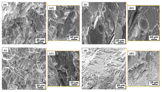 To improve morphological clarity, higher-magnification images (Figure 6(a1–d1)) were captured, revealing micro-dimples, void coalescence, and cleavage steps that correspond to the underlying fracture mechanisms. The evolution of the fracture characteristics correlates with the formation and coarsening of Ca-rich intermetallics, such as CaZn13 and Al2Ca1Zn, which act as stress concentrators and promote premature crack initiation.