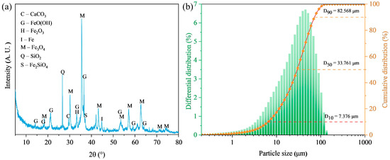 (a) XRD pattern and (b) particle size distribution of magnetic concentrate.