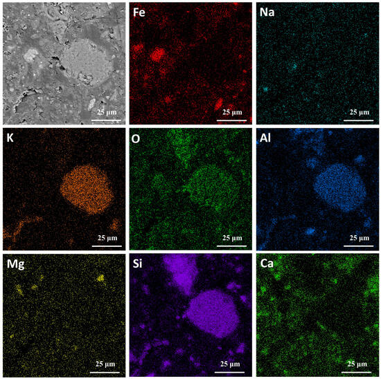The main phase components of the concentrate were Fe3O4, Fe2O3, FeO(OH) and Fe2SiO4, as shown in Figure 2a, in agreement with the chemical titration results (Table 4). The main phase components of the non-magnetic residue obtained after magnetic separation of iron-bearing tailings were SiO2, CaCO3, and CaMg(CO3)2, as shown in Figure 3. According to the particle size distribution analysis (Figure 2b), the magnetic concentrate had a median particle diameter (D50) of only 7.38 μm, with more than 90% of its particles (D90) smaller than 82.57 μm, as shown in. Figure 4 shows the SEM-EDS mapping analysis of the concentrate. Evidently, Fe exhibited a spatial distribution similar to O, confirming the presence of iron oxides and silicates.
