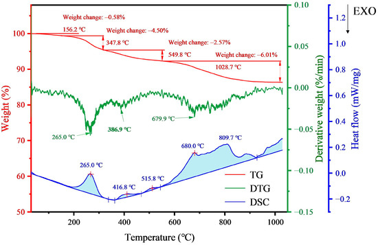 The thermal stability of the concentrate determined using the simultaneous thermal analyzer is shown in Figure 5. The weight loss process was divided into four stages. In the first stage, the weight loss was 0.58%, due to the loss of free water from the mineral, with a slight heat absorption peak. In the second stage, the weight loss reached 4.5%, attributed to the decomposition of iron carbonate, with a heat absorption peak formed at 200–300 °C (FeCO3 → FeO + CO2) [29,30]. In the third stage, a weight loss of 2.57% occurred, primarily ascribed to the removal of crystal water and the dehydroxylation of goethite (2FeO(OH) → Fe2O3 + H2O). There were two heat absorption peaks that occurred at 416.8 °C and 515.8 °C, respectively. In the fourth stage, a weight loss of 6.01% was found, associated with the decomposition of calcium carbonate [28,31], as partially revealed by a broad heat absorption peak spanning from 600 °C to 900 °C (CaCO3 → CaO + CO2). The thermogravimetric data indicated that the concentrate exhibited good thermal stability until about 900 °C, above which it might be reduced for producing DRI.
