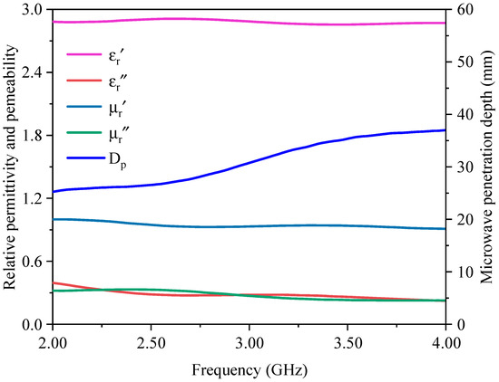 As mentioned before, the determination of the microwave absorption capability of magnetic concentrate based on the permittivity and permeability measurements could reveal its microwave reduction feasibility. As shown in Figure 6, within the frequency range 2–4 GHz, the magnetic concentrate had minor changes in εr′, εr″, µr′, and µr″. Notably, εr″ and µr″ had close values, suggesting that both dielectric loss and magnetic loss would control initial microwave heating of the concentrate. Specifically, at the commonly used frequency, 2.45 GHz, the concentrate had εr′ of 2.91, εr″ of 0.29, µr′ of 0.95, and µr″ of 0.34. Its microwave penetration depth was calculated to be 27 mm at room temperature, indicating its good microwave absorption capability [28].