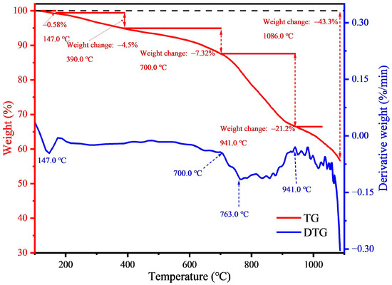To further investigate the microwave absorptivity of the concentrate, microwave thermogravimetric tests were conducted at 1800 W with a hydrogen flow rate of 0.5 L/min. As shown in Figure 7, the temperature of the concentrate under microwave irradiation reached 1100 °C within 33 min and the weight loss could be divided into four stages based on the DTG curve. The first stage, between 100 °C and 200 °C, involved the removal of free water, resulting in a weight loss of 0.58%. The second stage, between 200 °C and 700 °C, showed a slower weight loss, attributed to the removal of crystal water, decomposition of iron carbonate, and dehydroxylation of goethite, with a weight loss of 11.82%. In the third stage, from 700 °C to 900 °C, the weight loss rate increased, which was a result of the reduction of iron oxides such as Fe3O4 to FeO, producing a weight loss of 21.2%. The fourth stage, from 900 °C to 1100 °C, exhibited a lower weight loss rate, likely due to the slower reduction of FeO, with a weight loss of 9.7%. These results confirmed that the concentrate exhibited a strong microwave response, consistent with the microwave absorption capability analysis.