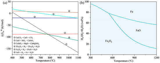 (a) △rGmΘ-T diagram of the main reactions involved in the reduction process of magnetic concentrate in the temperature range 400–1100 °C and (b) gas phase equilibrium diagram for hydrogen reduction of iron oxides.