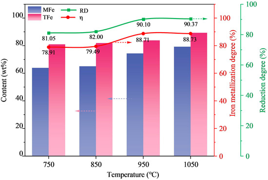 The effect of temperature on the hydrogen reduction performance of magnetic concentrate under microwave irradiation is shown in Figure 9. When the reduction temperature increased from 750 °C to 1050 °C, the TFe and content of metallic iron increased from 80.97 wt% and 63.90 wt% to 89.32 wt% and 79.25 wt%, respectively. Correspondingly, the reduction degree and iron metallization degree increased from 81.05% and 78.91% to 90.37% and 88.73%, respectively. The content of metallic iron increased by only 1.2% when the temperature increased from 750 °C to 850 °C, consistent with the TG-DTG-DSC analysis that showed a small weight loss between 750 °C and 850 °C. The reduction degree and iron metallization degree reached 90.10% and 88.71% at 950 °C, increased by 9.22% and 8.10% compared to the counterparts at 850 °C. This agreed with the presence of a weight loss peak around 950 °C in the TG-DTG-DSC analysis. With further increase in temperature from 950 °C to 1050 °C, the increase in reduction degree and iron metallization degree became less obvious. It indicated that the reduction kept proceeding with a slower rate because FeO limited the reaction progress, agreeing with the TG-DTG-DSC analysis in which the weight loss rate gradually decreased until the temperature approached 1050 °C.