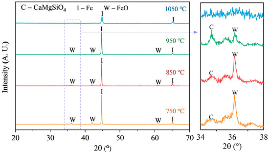 Along with changes in the reduction indexes, evident phase transformations might take place. To verify this, the XRD patterns of the products generated after hydrogen reduction of magnetic concentrate obtained by magnetic separation of iron-bearing tailings at different temperatures were obtained, as shown in Figure 10. When the temperature was 750 °C, the main phases were Fe and FeO, along with a small amount of CaMgSiO4. Increasing reduction temperature facilitated the reaction process, which was proven by a decline in the intensity of the diffraction peaks of FeO and enhanced intensity of the diffraction peaks of Fe. When the temperature exceeded 950 °C, the diffraction peaks of FeO disappeared, indicating its complete conversion.